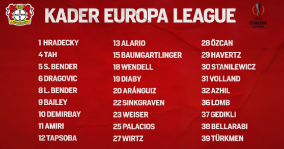 BOB体育在哪下载:1-赫拉德茨基、4-约纳坦-塔、5-斯文-本德、6-德拉戈维奇、8-拉斯-本德、9-利昂-贝利、10-德米尔拜、11-阿米里、12-塔普索巴、13-阿拉里奥、15-鲍姆加特林格、18-温德尔、19-穆萨-迪亚比、20-阿朗吉斯、22-辛克格拉文、23-米切尔-魏泽、25-帕拉西奥斯、27弗洛里安-维尔茨、28-厄兹詹、29-哈弗茨、30-斯塔尼列维奇、31-弗兰德、32-埃兹希勒、36-伦布、37-吉迪里、38-贝拉拉比、39-图克曼